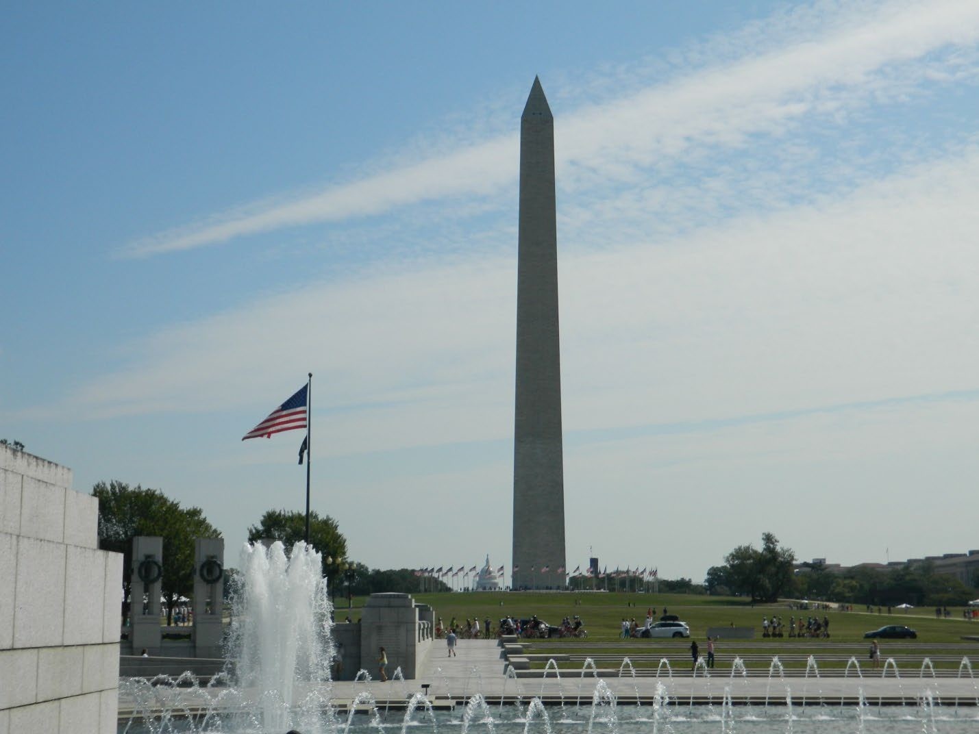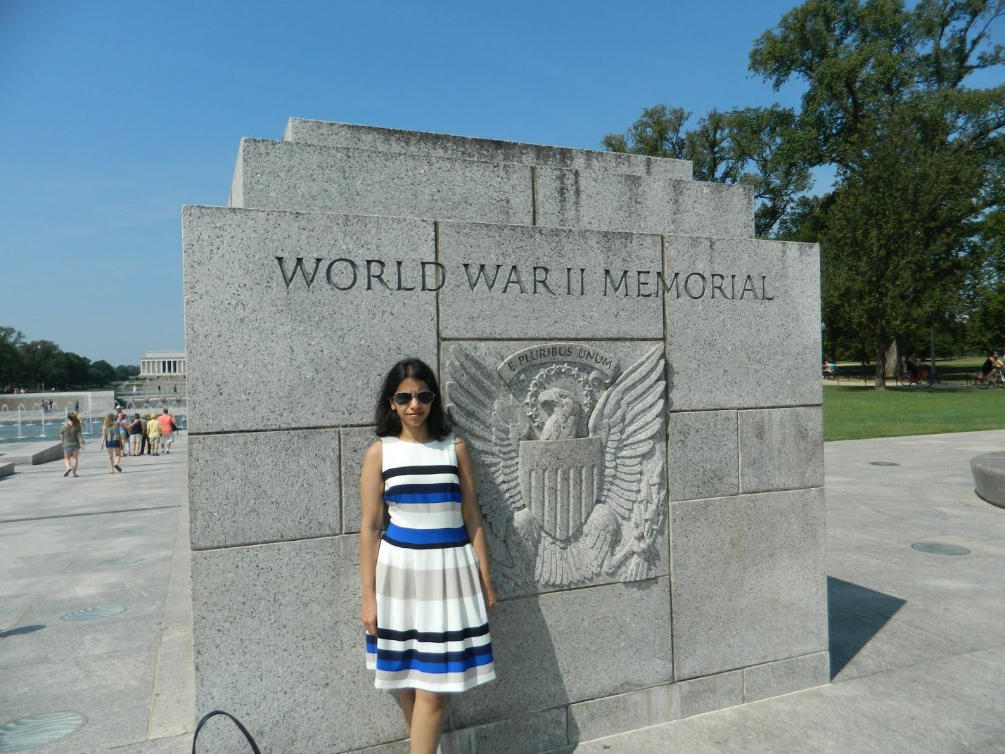 In the morning, we left around 9:00. We had coffee and some cakes at Starbucks. Pavan dropped us at the Abraham Lincoln Memorial. With Revathy, we walked to all the nearby places. During Abraham Lincoln's time, the US virtually faced a civil war over slavery. Lincoln led the northern states and was elected the 16th President of the US, putting an end to the slavery system. In Washington DC, the weather was quite hot; we actually found it difficult to walk. After this memorial, we saw another memorial created for the brave soldiers who sacrificed their lives during the Second World War. Next to this was the memorial for the first President of the U.S.A., George Washington—a tall pillar built to honor him.