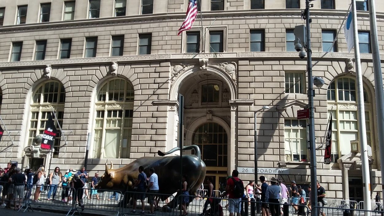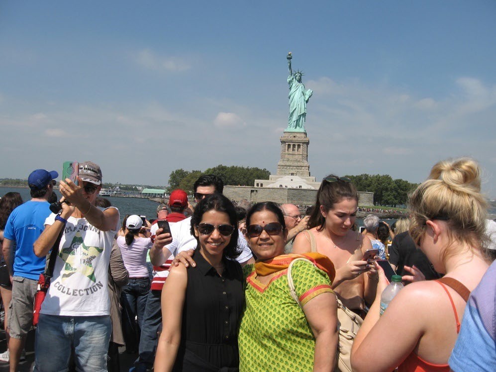From Grand Central, we took the subway to reach Bowling Green Station. This station is four stations away from Grand Central. From there, we took a cruise to Liberty Island. The cruise travel is about 30 minutes. We went to the top deck of the cruise and took photos. Liberty Island is a small patch of land in the sea. Here, the famous Statue of Liberty stands. The statue is made out of bronze, so it has turned into a sort of apple-green color. The gigantic statue is beautiful. The location where it is situated is amazing. Being on a small island, this statue is not interrupted by any building. The statue, surrounded by the blue sea, looks marvelous. The day was memorable to me. I never dreamt that one day my younger daughter would land here and take us to these wonderful places. My heart was so full from the love we received that I found it difficult to hold back tears of pure gratitude. We roamed around this place and purchased some tiny mementos. Also, we had ice cream and some fruits there. Then, by another cruise, we returned to Ellis. We walked to an Indian restaurant. On the way, we saw the Big Bull statue on the main street.